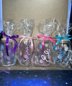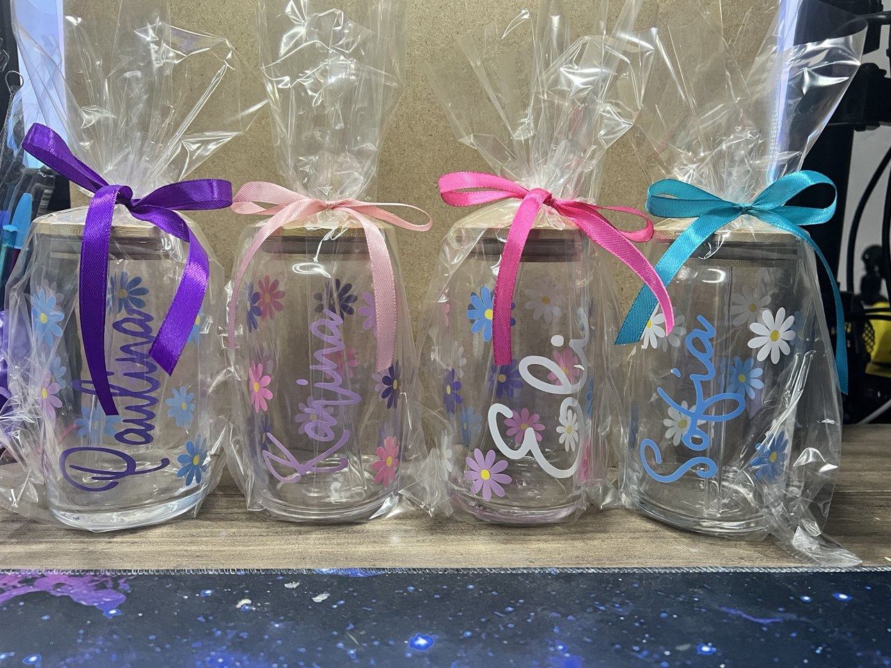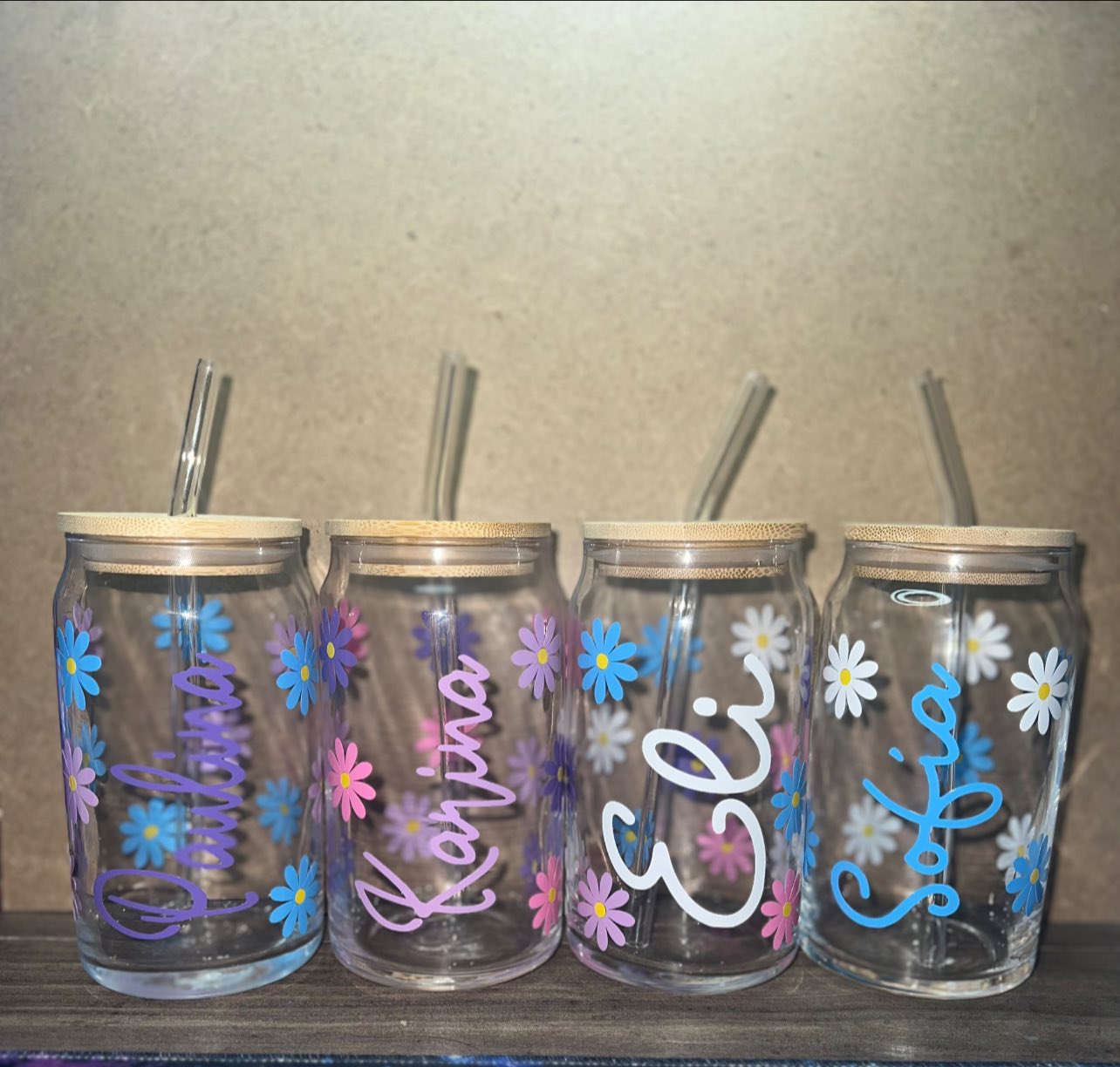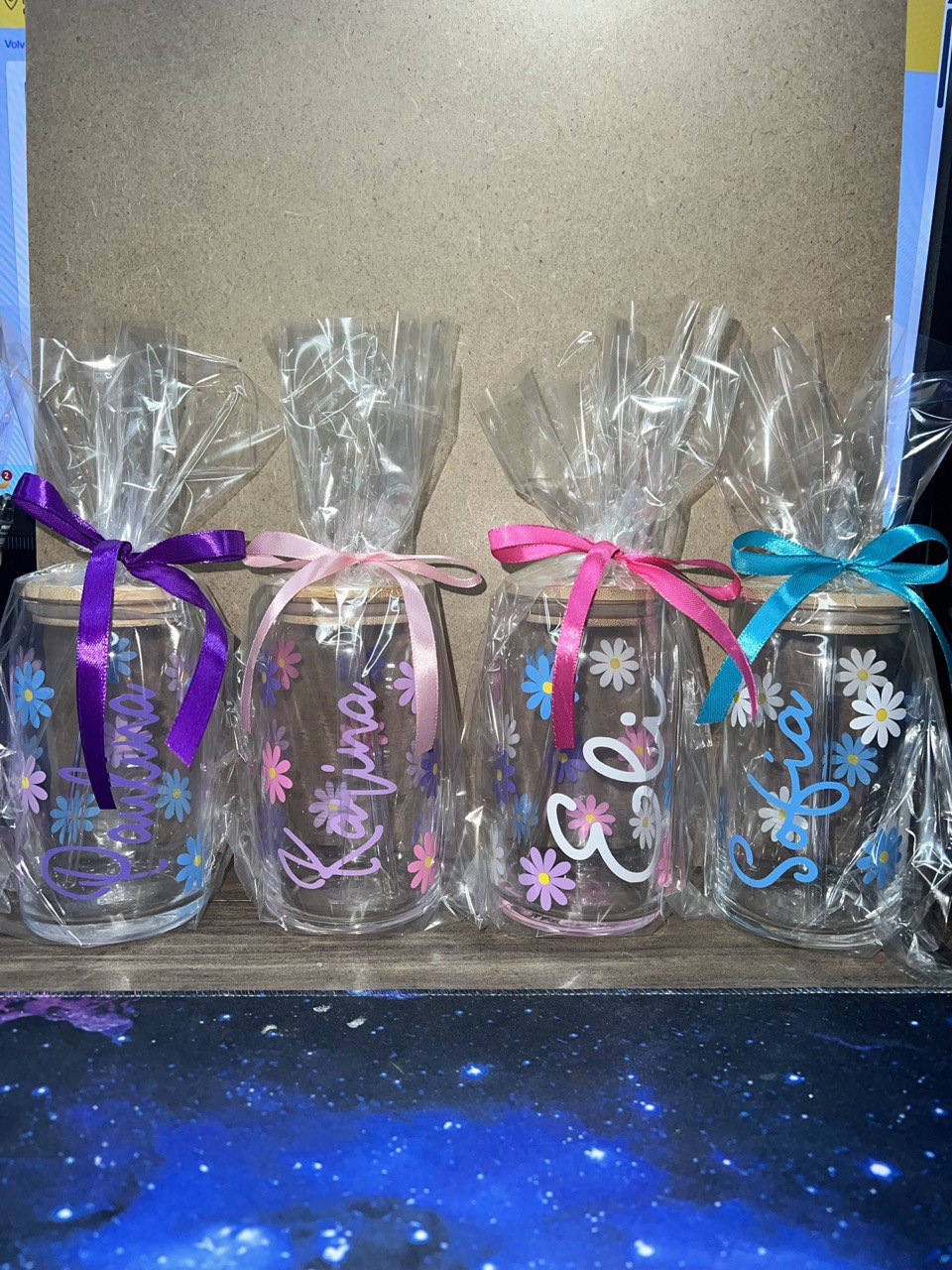 Vasos de vidrio con tapa de bambú y popote reutilizable, decorados con flores coloridas y nombre personalizado.